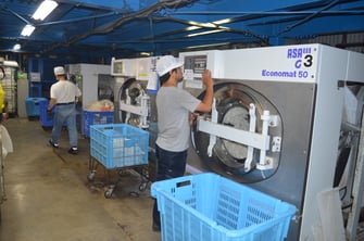 私たちロイヤルウォッシュは「ロイヤルクリーナ(株)リファイン大分」という会社から委託され、リネンサプライを主に行っております。リネンサプライとは、ホテルや旅館にシーツ・ホーフ・枕カバー・タオル・浴衣などをリースし、使っていただいたものをクリーニングするクリーニング業です。リファイン大分は、別府、湯布院、大分、県南、黒川など、大分県そして阿蘇にお客様がいらっしゃいます。そのシーツ類をクリーニングしているのが、私たちロイヤルウォッシュです。
